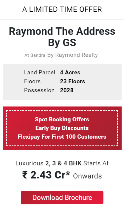 Experience luxury and modern living at Raymond The Address By GS, located in the upscale area of Bandra, South Mumbai. Offering spacious 2 & 3 BHK flats with stunning views of Yeoor Hills, this project features over 40 world-class amenities including a yoga zone, swimming pool, gym, and more, to enhance your lifestyle. Enjoy easy access to schools, malls, supermarkets, hospitals, and transportation links like the Western Express Highway and Bandra Railway Station, ensuring convenience at your doorstep. Live a life of luxury and ease at Raymond The Address By GS.